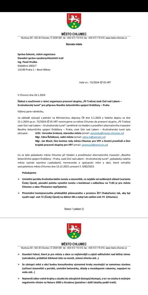Na základě jednání na Ministerstvu dopravy ČR ze dne 5.1. 2024 byla Správou železnic vytvořena pracovní skupina, do které si každé město a obec od Ústí nad Labem po státní hranice SRN nominovalo své zástupce a stanovilo požadavky pro hledání alternativní varianty. Pracovní skupina se bude pravidelně scházet až do června a hledat společně řešení pro trasování VRT, která území jednotlivých samospráv postihne co nejméně. Za Město Chlumec byla do pracovní skupiny SŽ nominována starostka Veronika Srnková, radní Edna Řeháková a člen komise rady města pro VRT Jan Musil. Požadavky našeho města jsou popsány níže. Vychází i z Memoranda o spolupráci měst a obcí, které schválilo i naše ZM.Mezi ty nejdůležitější patří posunutí portálu Krušnohorského tunelu🛤 co nejdále od obydlených oblastí. První schůzka pracovní skupiny proběhla dnes 31.1.2024 v Congress hotelu Clarion v Ústí nad Labem.